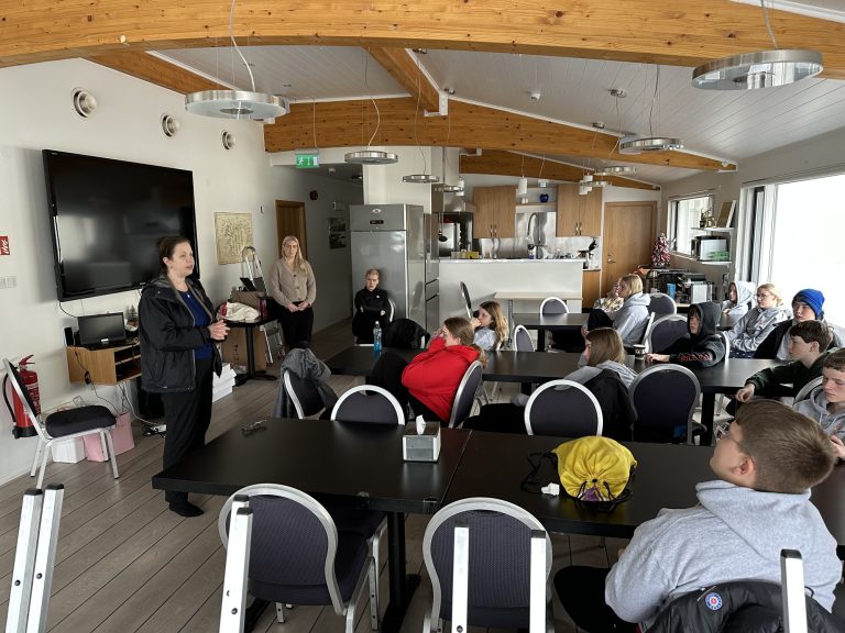 Á Eskifirði var hluti af hópnum í sjávarútvegskóla unga fólksins eins og áður nefndi. Það eru þær Katrín Axelsdóttir og Guðdís Benný Eiríksdóttir, nemar í sjávarútvegsfræðum, sem hafa umsjón með skólahaldinu á Austfjörðum í sumar.