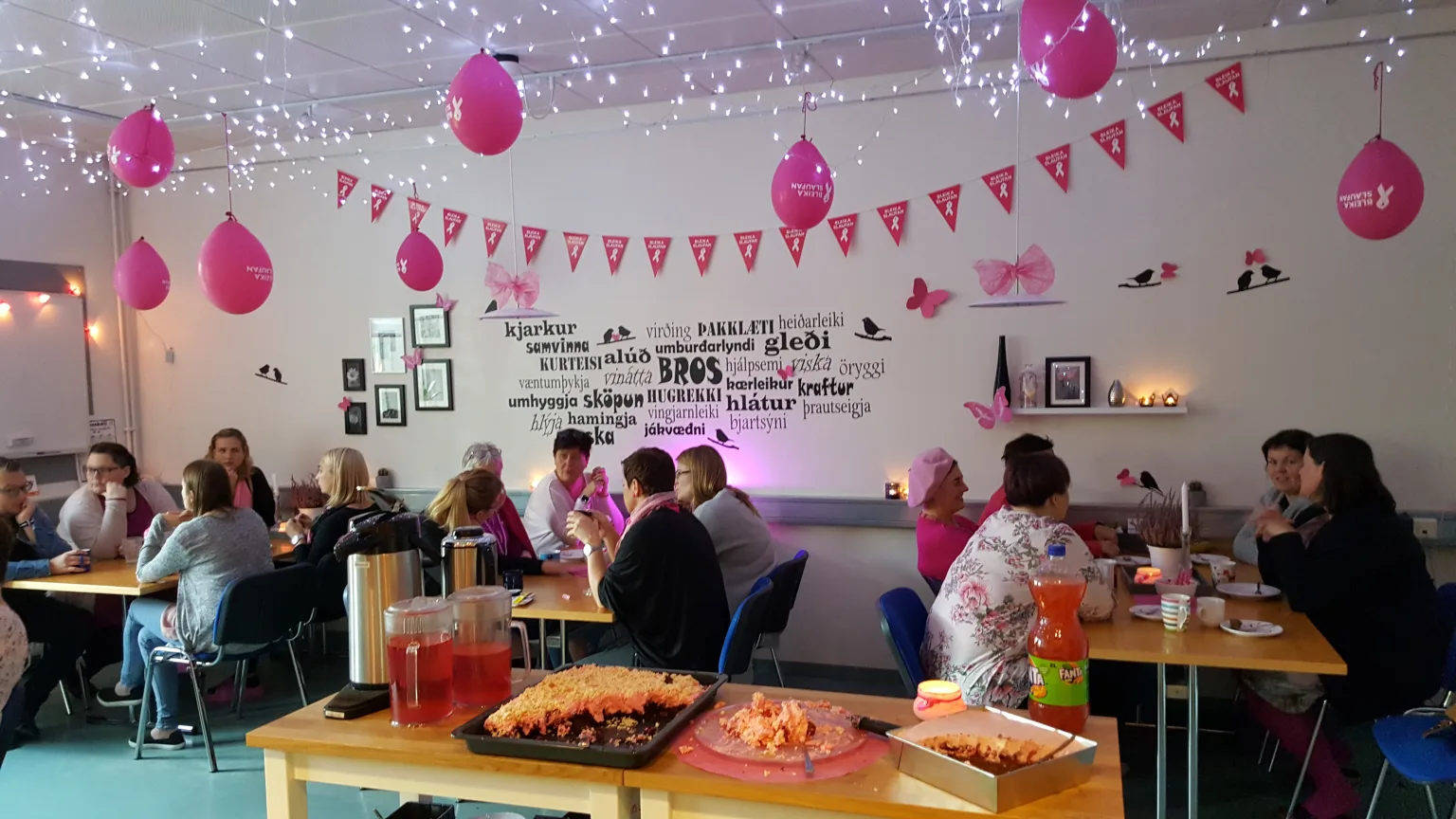 Í Grunnskólum Fjarðabyggðar var haldið uppá daginn og nemendur og starfsfólk klæddist bleiku og skreytti skólana í bleikum litum. Á meðfylgjandi mynd má sjá 10. bekk Grunnskóla Reyðarfjarðar en hann var að þessu sinni valinn bleikasti bekkurinn í skólanum. Á hinni myndinni má sjá inná kaffistofu starfsfólks Nesskóla en hún var skreytt bleik í tilefni dagsins.