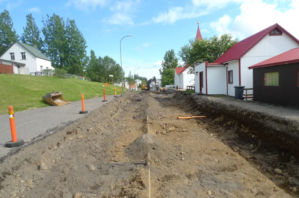 Nú er unnið að jarðvegsskiptum á 300 m löngum kafla frá Skólavegi 87 að kirkjunni. Mikið er af alls kyns lögnum í götunni og eins og oft er þegar um gamlar götur er að ræða er lítið af gögnum til um legu þeirra. Verktakinn þarf því að beita mikilli lagni við að komast hjá þeim við gröftinn eins og sjá má á myndunum.