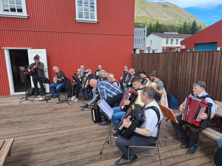 Í gær kom færeyska harmonikkubandið Fuglafjarðar harmonikufelag í heimsókn í Safnahúsið á Norðfirði og tróð upp fyrir áhorfendur á pallinum. Veðrið lék við gesti og stigu sumir dans við harmonikkutónana.
