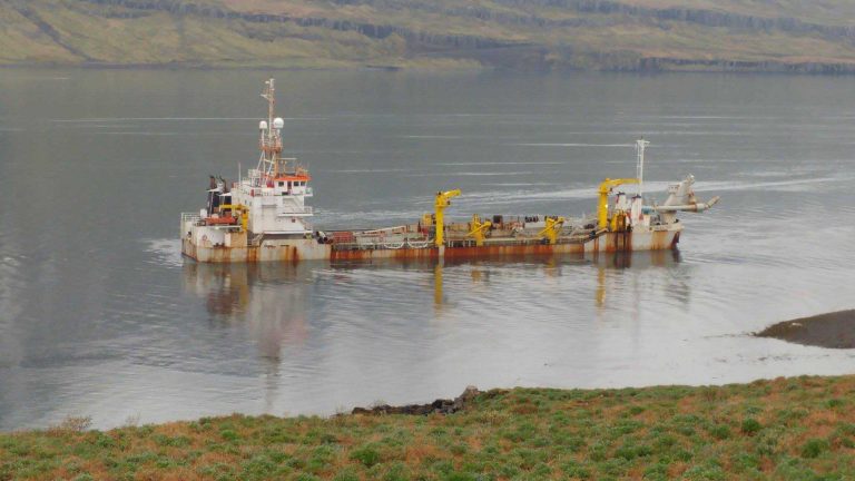 Áætlað er að skipið Galilei komi þrisvar sinnum til að dæla í landfyllinguna á Mjóeyri og það er von Hafnarstjórnar að framkvæmdum við stækkun hafnarinnar ljúki næsta vor.