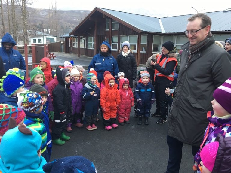 Bæjarstjóri afhenti leikskólanum fánann fyrir hönd Landverndar, sem er samstarfsaðili Foundation for Environmental Education (FEE) hér á landi.