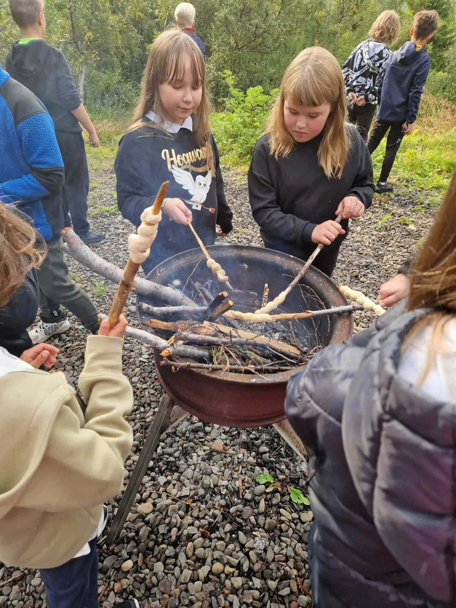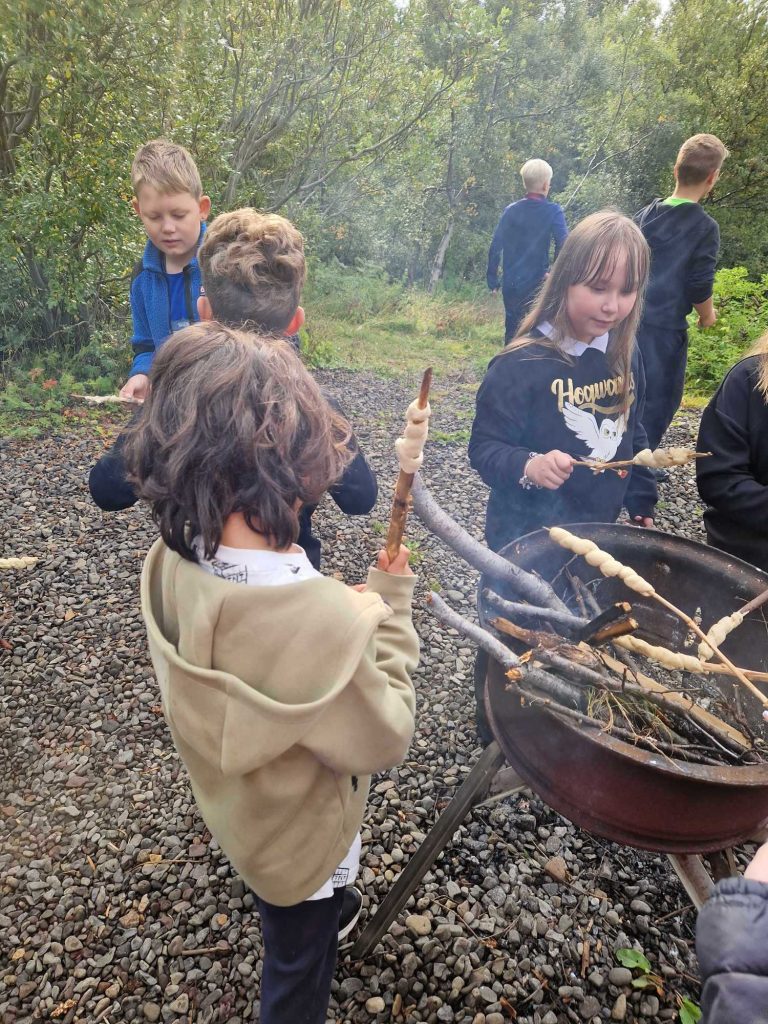 Meðfylgjandi eru einnig myndir frá 5.GJS en þau fóru að tálga og svo var farið í leik sem reynir á samvinnu nokkra einstaklinga. Leikurinn er þannig að hver hópur fær teygjur, spotta og glös. Á hópurinn að stafla glösunum í pýramída og ganga frá þeim aftur án þess að snerta glösin. Auðvitað þarf að undirbúa spottana og teygjur fyrst svo þetta sé gerlegt. Samvinnan er eitthvað sem við reynum að vinna með alla daga enda er það vinna sem allir þurfa að horfast í augu við alla ævi.