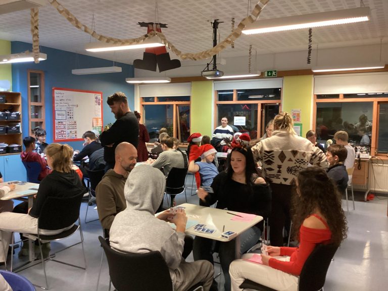 Þetta var svokallaður tvöfaldur dagur því allir mættu aftur seinni partinn í aðventustund með foreldrum. Mikið líf og fjör var í stofunum hjá yngsta og miðstigi þar sem krakkarnir voru að perla, tefla, föndra og spila Kahoot, á meðan elsta stigið spilaði vist af miklum móð.