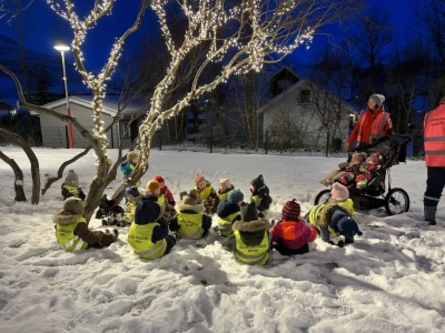 Einiholt, Greniholt og Asparholt halda til í garðinum enda eiga stuttir fætur erfiðara með að ferðast um í snjónum. Tréð okkar í garðinum var skreytt ljósum svo yngri deildirnar komu sér fyrir undir trénu, sungu jólalög og fengu svo smákökur og heitt kakó.