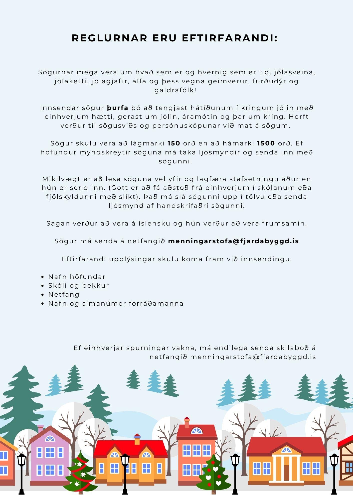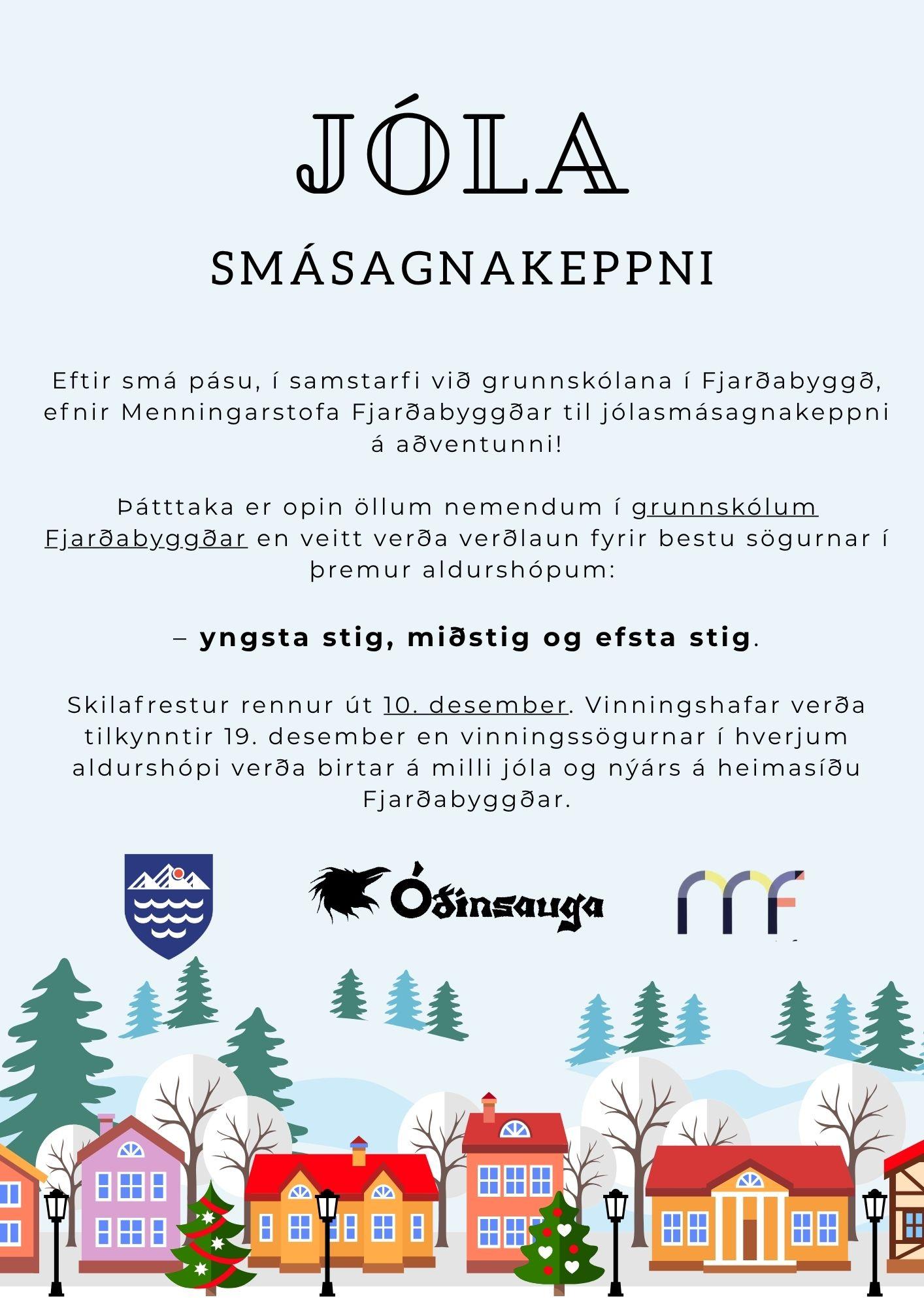 Skilafrestur rennur út 10. desember. Vinningshafar verða tilkynntir 19. desember en vinningssögurnar í hverjum aldurshópi verða birtar á milli jóla og nýárs á heimasíðu Fjarðabyggðar