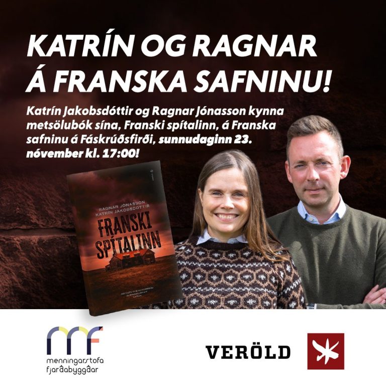 Katrín Jakobsdóttir og Ragnar Jónasson lesa upp úr nýrri metsölubók sinni — Franska spítalanum — á Franska safninu á Fáskrúðsfirði sunnudaginn 23. nóvember kl. 17:00.