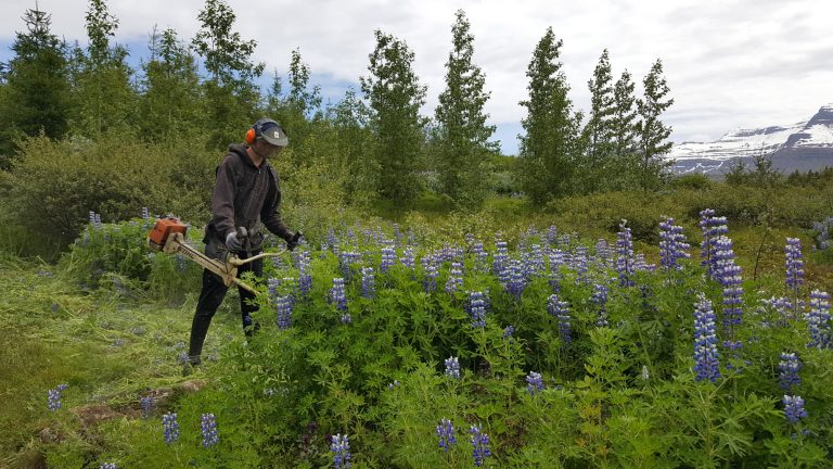 Á myndinni með fréttinni má sjá starfsmann sveitarfélagsins slá lúpínu sem hefur tekið sér bólfestu innan um annan gróður.