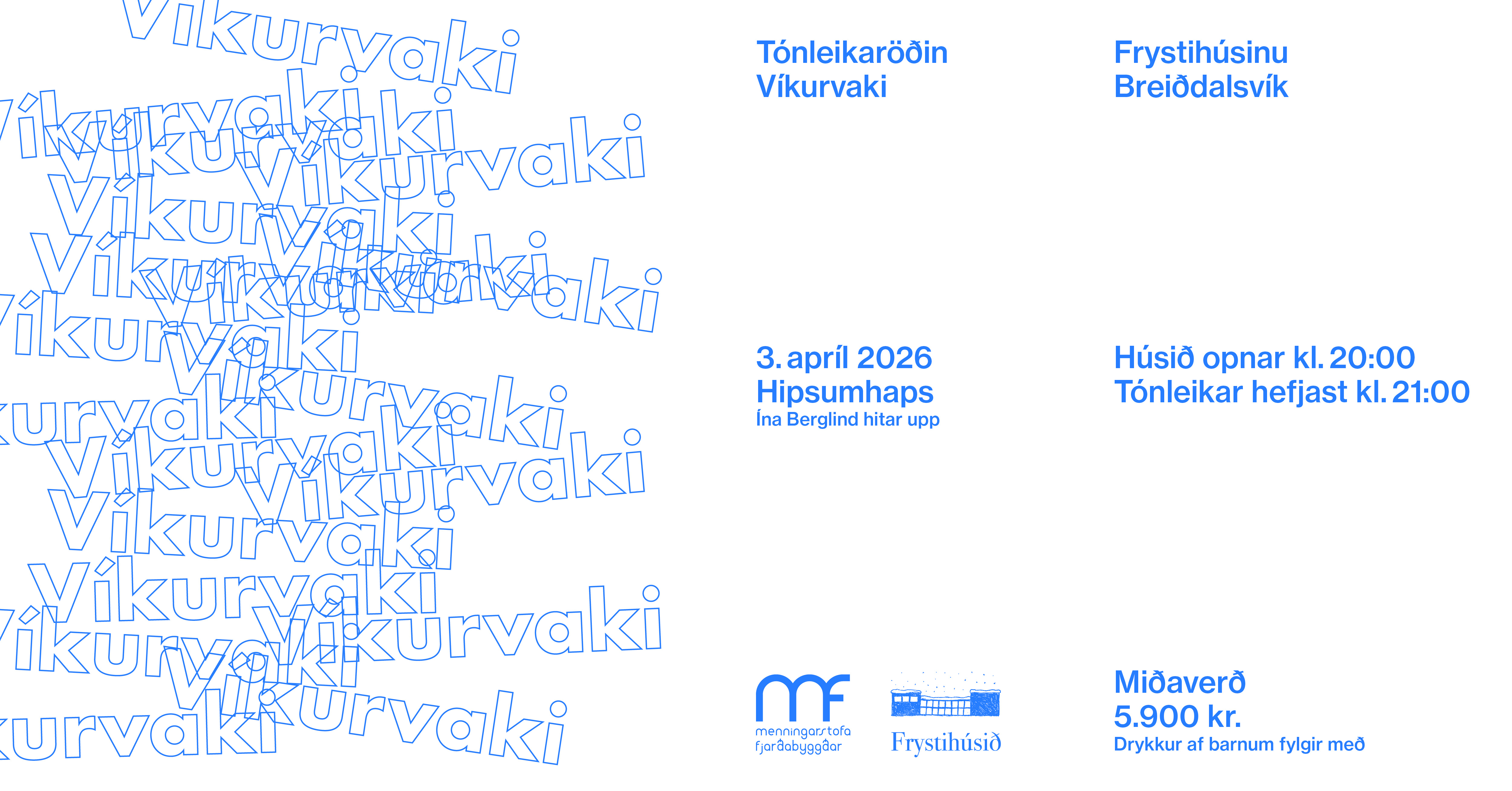 Föstudaginn 3. apríl hefst ný tónleikaröð, Víkurvaki, í Frystihúsinu á Breiðdalsvík þegar hljómsveitin Hipsumhaps stígur á svið. Kvöldið markar upphaf metnaðarfulls verkefnis sem ætlað er að efla tónlistarlíf á Austurlandi og styrkja Frystihúsið sem mikilvægan tónleikastað.