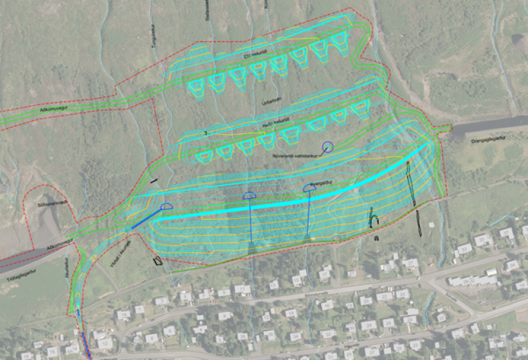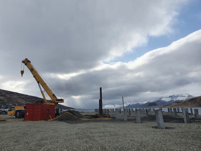 Framkvæmdir við nýja bryggju á Eskifirði halda áfram. Eftir að niðurrekstri staura lauk í febrúar síðastliðnum er nú hafinn niðurrekstur á stálþilsplötum í bakþil bryggjunnar og sjá Kranar ehf. um verkið. Það verk mun klárast á þessu ári ásamt því að steyptar verða undirstöður stormpolla. Unnið er að hönnun lagna á svæðinu í samstarfi við Eskju og Skeljung