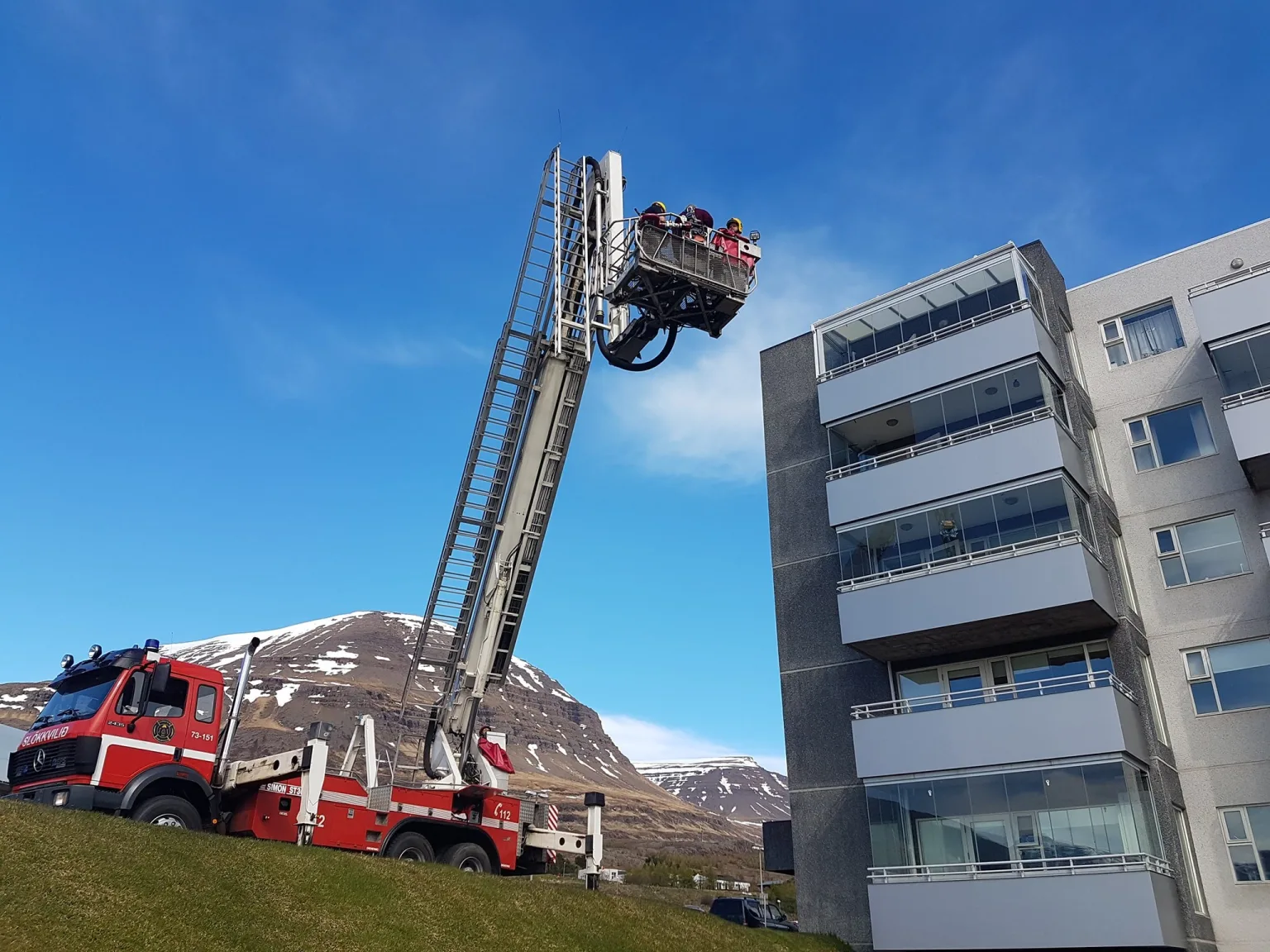 Nokkrir íbúar létu sig ekki muna um að vippa sér af svölum á 6. hæð yfir í björgunarkörfuna. Æfingin gekk afar vel og ekki var að sjá að lofthræðsla hefði hrjáð íbúa.