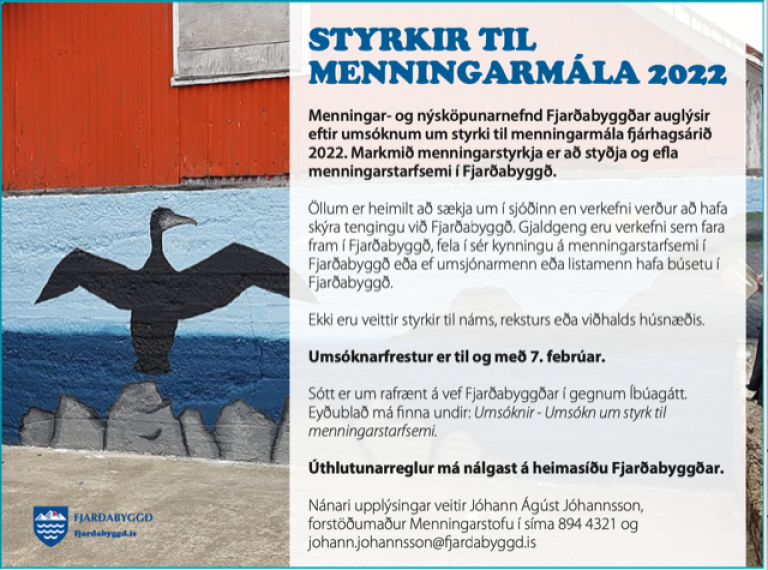 Nánari upplýsingar veitir Jóhann Ágúst Jóhannsson, forstöðumaður Menningarstofu í síma 894 4321 og johann.johannsson@fjardabyggd.is
