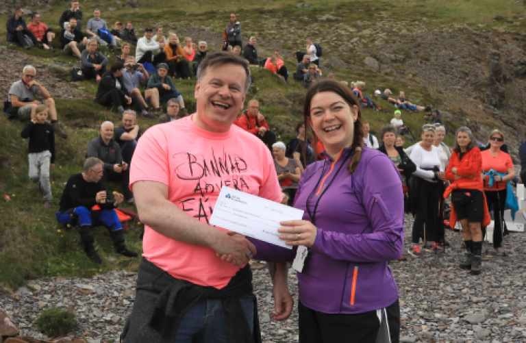 Bæjarstjóri Fjarðabyggðar, Karl Óttar Pétursson tók við styrknum frá Dagmar Ýr Stefánsdóttur yfirmanni samskipta og samfélagsmála hjá Alcoa Fjarðaáli á Borgarsandi á Hólmanesi. Í baksýn á myndinni má sjá gesti Gönguviku Fjarðabyggðar auk starfsmanna Fjarðaáls sem var búið að týna rusl úr fjörunni inn að álveri.