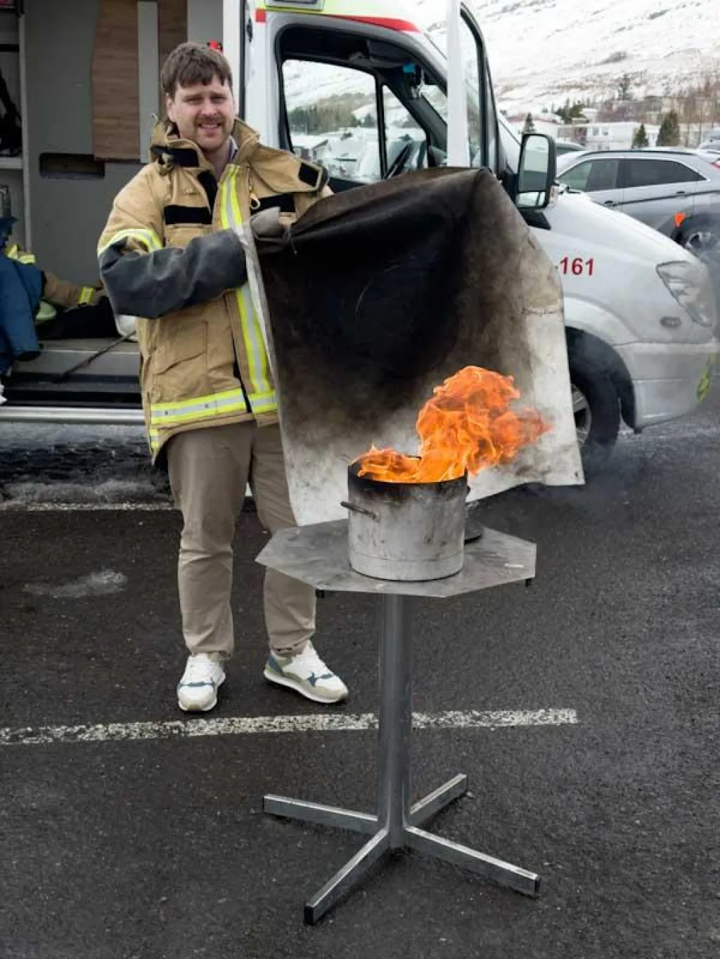 Slökkvilið Fjarðabyggðar sýndi hvernig ætti að bera sig að við að slökkva olíueld með eldvarnarteppi og fengu gestir að spreyta sig á því, ásamt því að sýna sjúkrabíl slökkviliðsins og þann búnað sem þeir hafa.