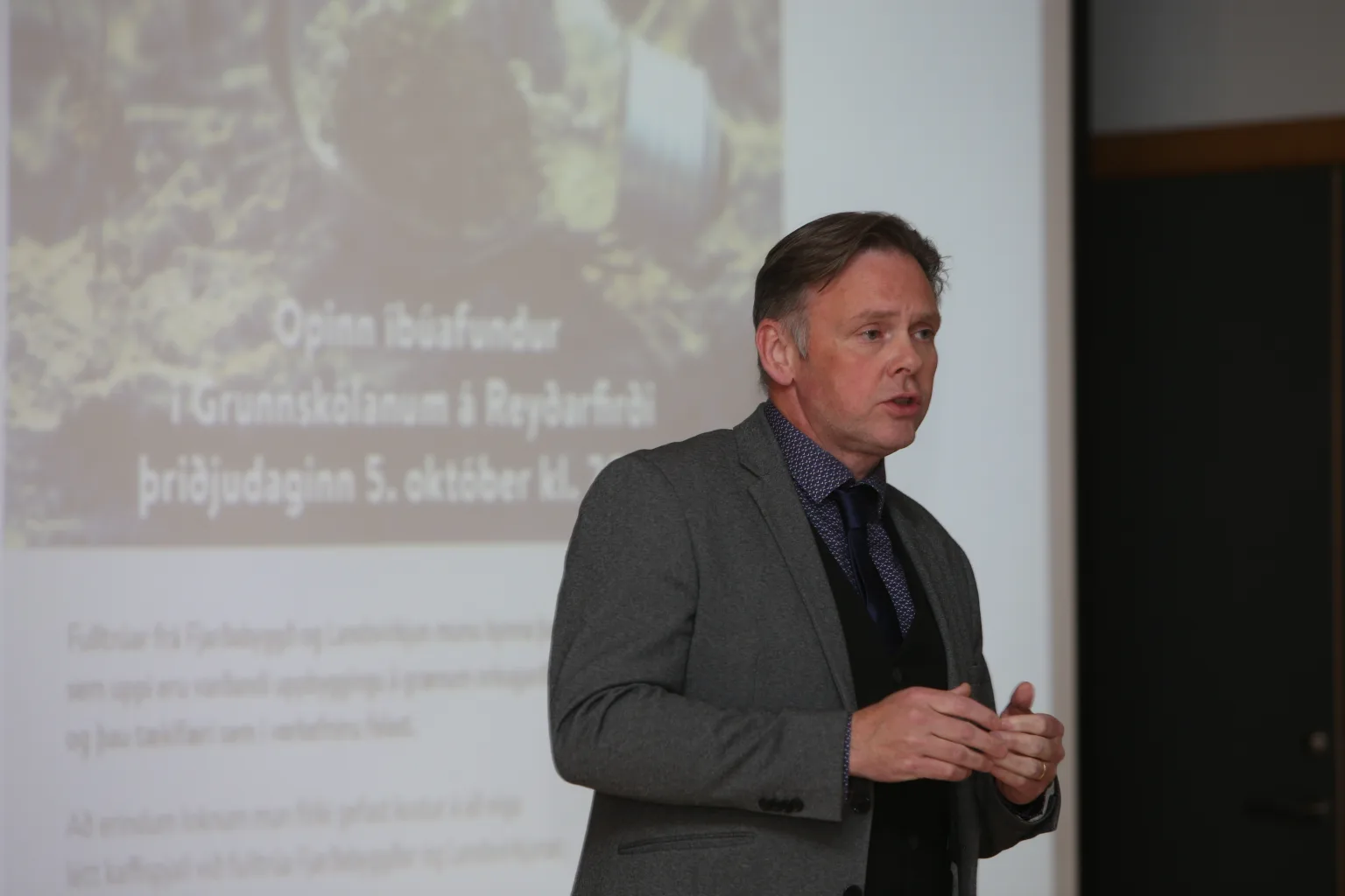 Jón Björn Hákonarson bæjarstjóri Fjarðabyggðar opnaði fundinn og bauð fólk velkomið. Hann fór yfir tilurð fundarins og lagði í máli sínu áherslu á hve spennandi verkefni væri um að ræða fyrir samfélagið í Fjarðabyggð. Á eftir honum kynnti Laufey Lilja Ágústsdóttir, sérfræðingur um grænan rekstur hjá Landsvirkjun, hugtakið grænn orkugarður, hvað í honum felst og þau stóru verkefni sem framundan eru varðandi orkuskipti.