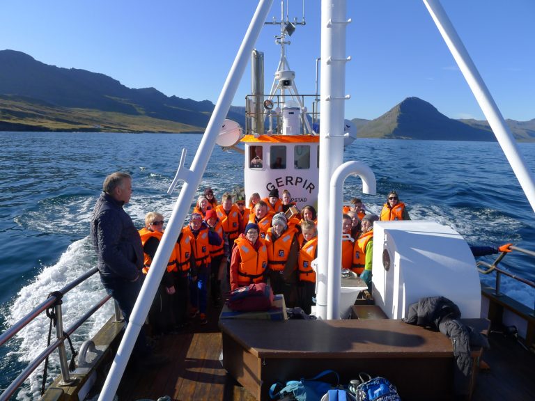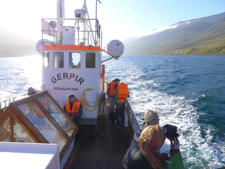 Siglt var á skemmtibátnum Gerpi, glæilegum trébát frá Norðfirði, sem Hildibrandhótel nýtir í ferðaþjónustu. Fyrst var siglt fyrir mynni eyðifjarðanna Hellisfjarðar og Viðfjarðar og farið yfir sögu staðanna um leið og farið var yfir helstu kennileiti. Þá var siglt að Barðsnesi og Rauðubjörgum og síðan framhjá Norðfjarðarnípunni, hæsta standbergi á Íslandi, á leiðinni til Mjóafjarðar og sást þá vel til Dalatanga, austustu byggðar á Íslandi.