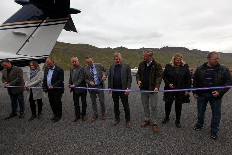 Að loknum stuttum ræðuhöldum voru það svo fulltrúar þeirra sem stóðu að verkinu sem klipptu á borða ásamt Jóni Gunnarssyni samgöngu- og sveitarstjórnarráðherra.