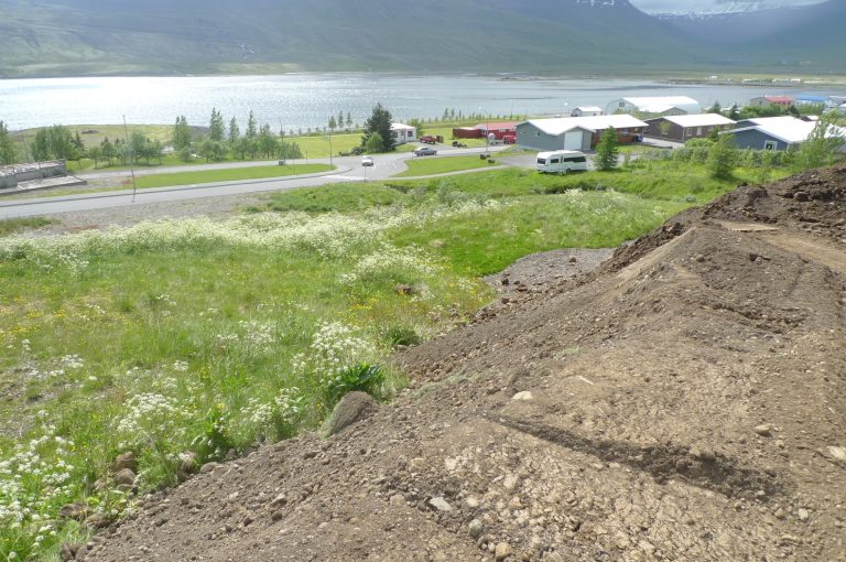 Það efni sem tekið er úr götunni verður nýtt í umhverfisverkefni. Því er keyrt í brekkuna sem er rétt fyrir neðan hjúkrunarheimilið Uppsali, þar sem það verður sléttað niður og síðan verða þökur lagðar yfir. Ásýnd brekkunnar verður því mun betri en áður. Svæðið sem um ræðir má sjá á mynd hér að neðan.