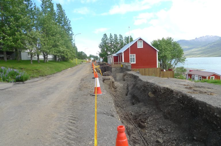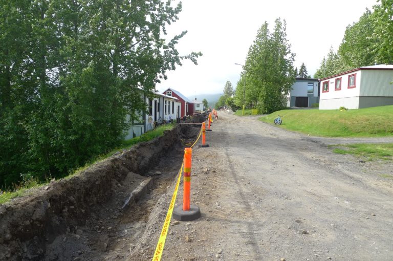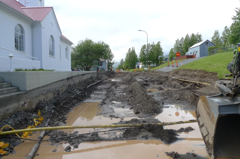 Nú er unnið að jarðvegsskiptum á 300 m löngum kafla frá Skólavegi 87 að kirkjunni. Mikið er af alls kyns lögnum í götunni og eins og oft er þegar um gamlar götur er að ræða er lítið af gögnum til um legu þeirra. Verktakinn þarf því að beita mikilli lagni við að komast hjá þeim við gröftinn eins og sjá má á myndunum.
