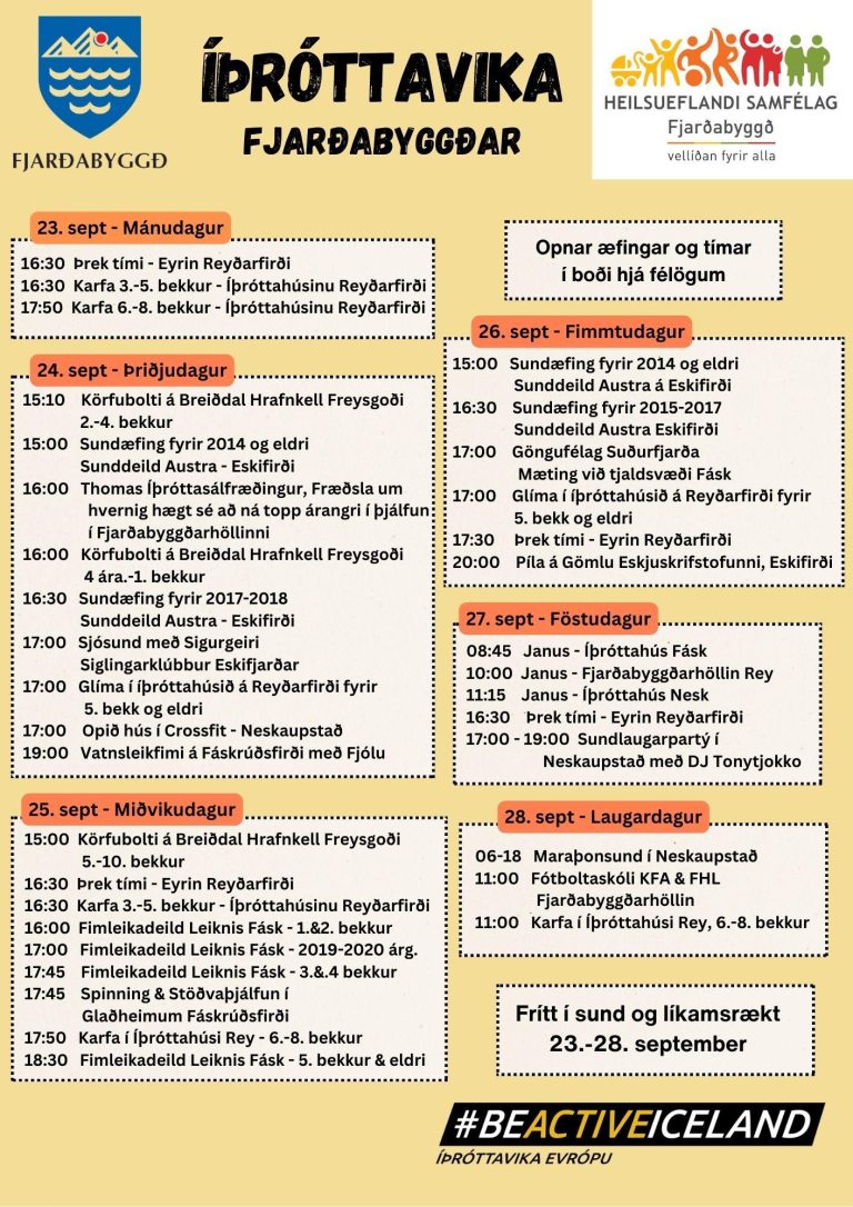 Fjarðabyggð hvetur öll íþróttafélög í Fjarðabyggð, samtök og einstaklinga til að taka virkan þátt í íþróttavikunni með því að skipuleggja opnar æfingar og opin hús, viðburði eða aðrar uppákomur sem tengja má með beinum og óbeinum hætti við líkamlega og andlega hreyfingu og heilsu.