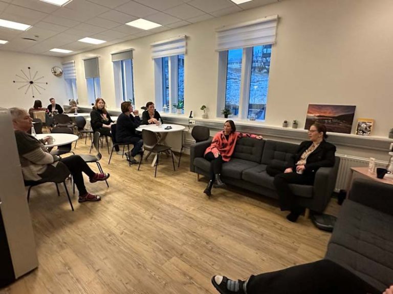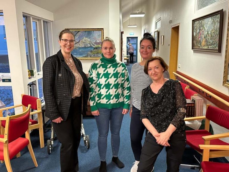 Að lokum var haldið yfir í Breiðablik, sem eru þjónsutuíbúðir aldraðara. Þar tók á móti okkur Helga Sól Birgisdóttir, forstöðumaður stuðnings- og heimaþjónustu. Á Breiðablik búa 28 íbúar, þar eru 26 íbúðir, níu hjónaíbúðir og 17 einstaklingsíbúðir. Þegar við komum voru íbúarnir að gæða sér á vöfflum og eplaböku. Jóna Árný byrjaði á að kynna sig og fór stuttlega yfir það sem hún hafði verið að gera yfir daginn. Íbúar mættu tilbúnir til leiks með ýmis málefni sem þeir höfðu áhuga á að ræða við bæjarstjórann. Helst voru það málefni sem snúa að viðhaldi og nýtingu á rýmum í Breiðabliki m.t.t. samveru og ýmiskonar aðstöðusköpunar. Bæjarstjóri fékk ýmsar góðar ábendingar og upplýsingar sem munu nýtast í næstu skrefum. Íbúarnir höfðu jafnframt orð á því hversu ánægðir þeir væru með það starfsfólk sem starfa í Breiðablik og augljóst af vöffluilminum að allir lögðust á eitt við að skapa notalega stund þennan daginn.