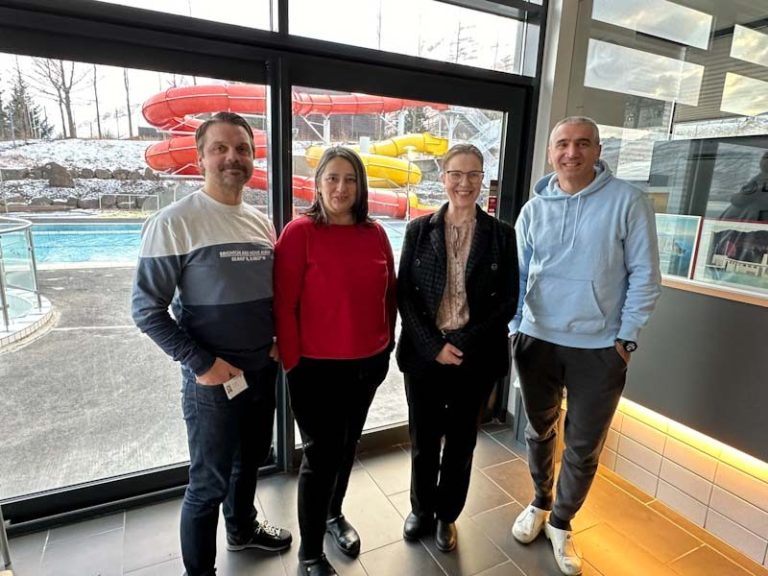 Frá höfninni var svo haldið í íþróttamiðstöðina, þar tók á móti okkur Sigurjón Egilsson, forstöðumaður Íþróttamiðstöðvar Norðfjarðar, ásamt þeim Goran Nikolic og Saga Zagorkia, en það er gaman að segja frá því að samanlagður starfsaldur þeirra Goran og Sögu er 32 ár. Góð ásókn hefur verið í sundlaugina á Norðfirði, en um 200 gestir koma þangað daglega. Óhætt er að segja að íbúar séu duglegir að nýta sér aðstöðuna og þegar okkur bar að garði streymdu börn úr grunnskólanum í skólasund. Þeim fannst greinilega gott að hlýja sér í vaðlauginni áður en haldið var út í laug að æfa sundtökin undir stjórn sundkennarans. Stefánslaug, eins og hún er gjarnan kölluð var fyrst opnuð árið 1943. Árið 2016, ákvað bæjarstjórn að framvegis yrði laugin nefnd Stefánslaug til heiðurs Stefáns Þorleifssonar, sem þá varð 100 ára, en hann var fyrsti forstöðumaður sundlaugarinnar og forvígismaður að byggingu hennar. Góð aðstaða er í lauginni, tvær vatnsrennibrautir ásamt tveimur heitum pottum, barnalaug og gufubaði auk þess sem líkamsræktarsalur er á jarðhæð hússins.