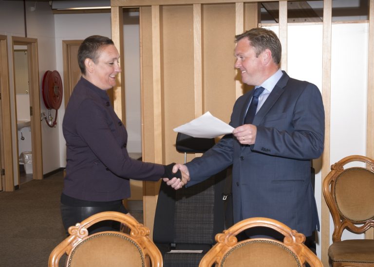 Jón Björn Hákonarson, forseti bæjarstjórnar Fjarðabyggðar, afhenti Ólöfu Nordal, innanríkisráðherra, bókunina, sem samþykkt var á fundi bæjarráðs í Neskaupstað í morgun. Afhendingin fór fram í flugstöðvarhúsi Norðfjarðarflugvallar.