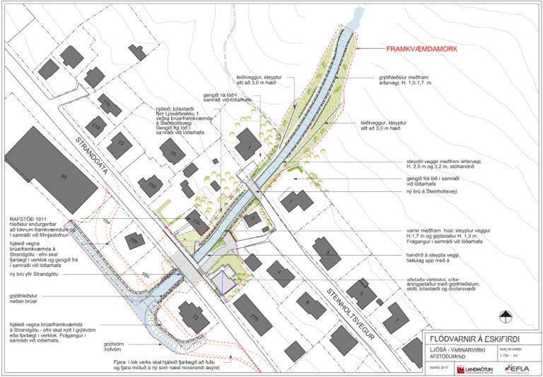 Framkvæmdirnar snúa að gerð varnarvirkja ásamt mótvægisaðgerðum. Varnarvirkin fela í sér nýjar brýr yfir Strandgötu og Steinholtsveg, steypta leiðiveggi og farveg með hlöðnum og steyptum veggjum.