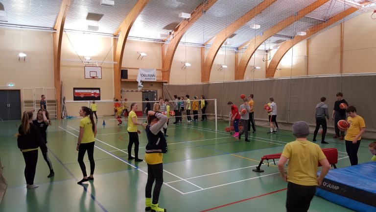 Nemendunum var skipt í lið eftir litum og þvert á byggðakjarna. Íþróttakennarar í skólunum höfðu komið upp stöðvum þar sem voru fjölbreyttar þrautir. Þrjár stöðvar voru í íþróttahúsinu en ein var í Nesskóla. Þegar litið var við í íþróttahúsinu rétt fyrir hádegi var verið í stinger, skotbolta, bandý og troðslukeppni með aðstoð trampólíns. Eins og sjá má á myndunum var gleði og samkennd ríkjandi á meðal nemendanna og bros á hverju einasta andliti þó keppnisskapið hafi ekki verið langt undan.