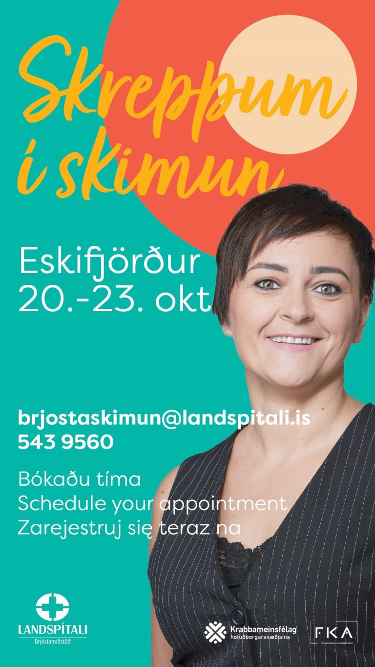 Brjóstamiðstöð Landspítalans er með brjóstaskimun í samstarfi við Heilsugæsluna á Eskifirði, dagana 20. - 23. október.