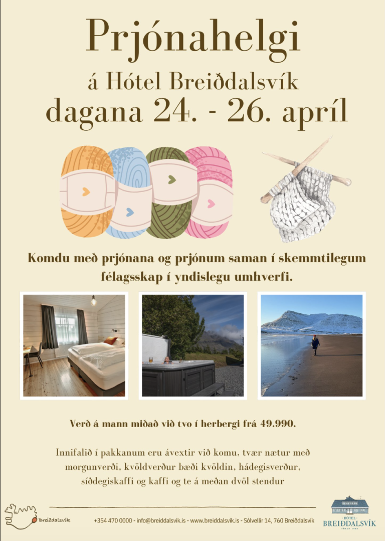 🛏 Gisting í 2 nætur ásamt glæsilegu morgunverðarhlaðborði. 🍽 Kvöldverður bæði föstudags- og laugardagskvöld. 🍴 Ljúffengur hádegisverður. ☕ Síðdegiskaffi og spjall. 🎁 Sérstakur glaðningur fyrir þátttakendur. 🥓 Brunch hlaðborð á sunnudegi fyrir brottför 🛁 Sauna og heitur pottur opið alla helgina 🚶♀️ Útivist: Hressandi gönguviðburður á Streitishvarfi. 🧶 Lærdómur: Prjónastund með Silju Dögg (leiðbeiningar fyrir alla). 🐑 Fræðsla: Guðný Harðardóttir sýnir og segir frá sinni vinnslu á garni. 🎨 Sýning: Handverkssýning eftir Þorbjörgu Sigríði Jónsdóttur 💡 Pubquiz: Skemmtilegur spurningaleikur Verð á mann fyrir tveggja manna herbergi: 49.990kr